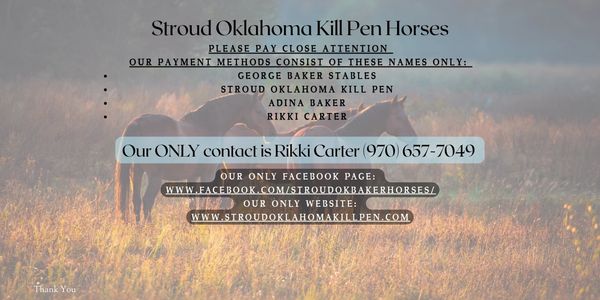 All equine listed by Stroud Oklahoma Kill Pen Horses/Baker Stables is sold as- is and on a first come first serve basis.
